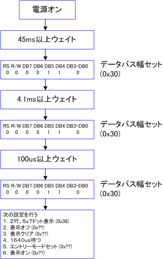 LCDに対して各種インストラクションを送ったり,文字コードを送ったりする前に,LCDモジュールの初期化を行う必要がある.初期化では接続バス幅の設定や各種動作モードの設定を行う.